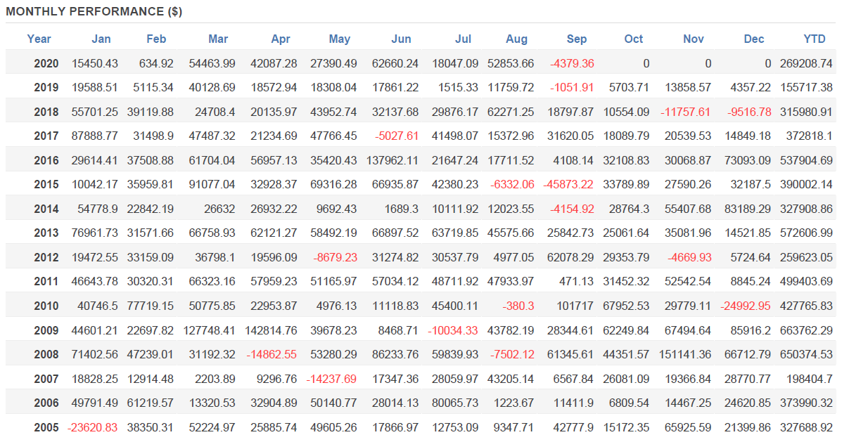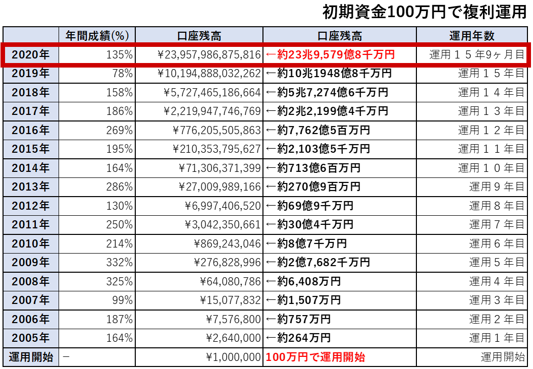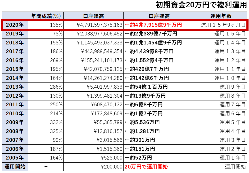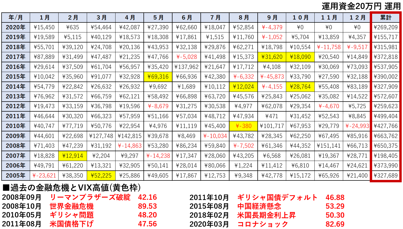 2005年1月1日~2020年9月30日までの月間・年間の成績(初期資金20万円の単利運用)