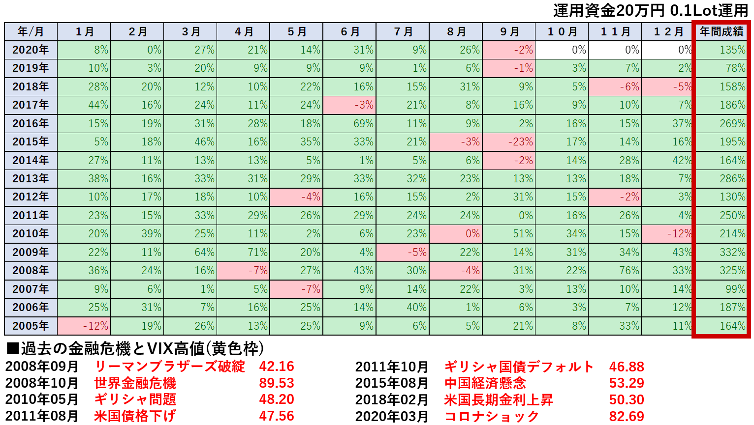 リーマンショック時や世界金融危機の年も年間プラス成績でした。