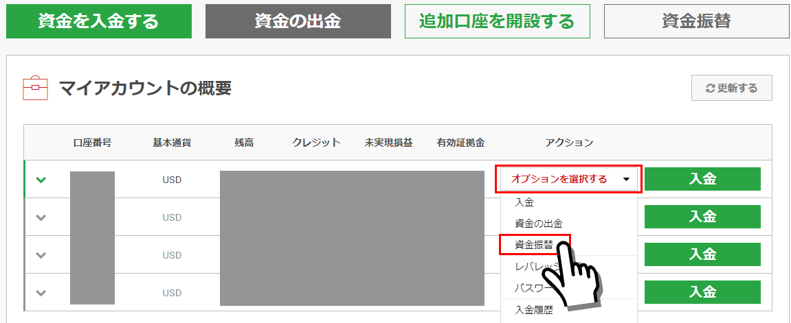 2.振替元の口座の『オプションを選択する』から『資金振替』をクリックします。