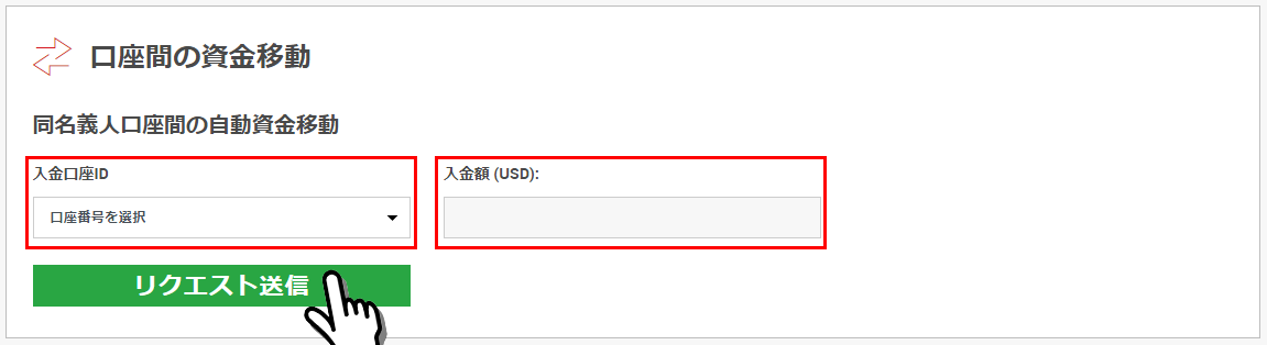 3.『口座間の資金移動』画面で、入金口座IDフォームから資金移動先(振替先)口座IDを選択して、入金額フォームに振り替える金額を入力して、『リクエスト送信』ボタンをクリックします。